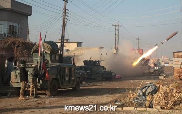 이라크 군이 모술에서 로켓을 발사하고 있다.