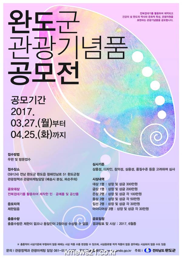 완도군(군수 신우철)은 전국 전복 생산량의 81%를 차지하는 완도군의 주요 특산품인 전복을 활용한 관광기념품 공모전을 개최한다.