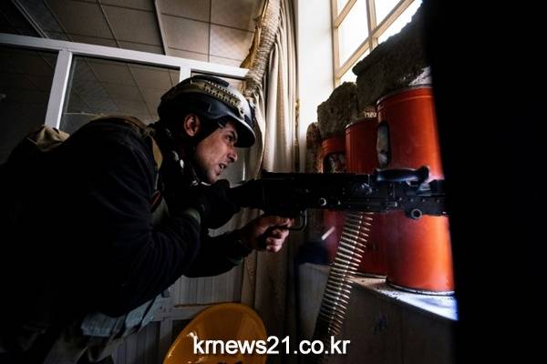 이라크 특수부대원이 모술 대학 건물 안에서 기관총을 발사하고 있다. 모술 탈환 작전 중인 이라크군은 15일(현지시간) IS가 기지로 사용하던 모술 대학을 탈환했다고 밝혔다.