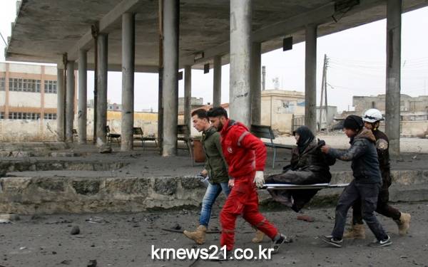 시리아 이들리브의 한 버스 정류장에서 공습에 부상당한 여성.