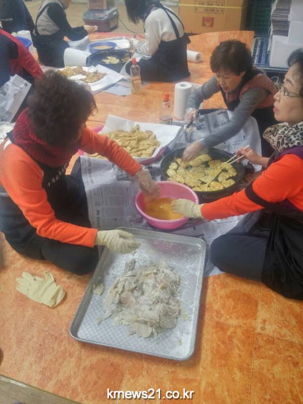 자원봉사자 등 30여 명은 지난 23일부터 24일까지 동태 ․ 꼬치 ․ 완자전 등 삼색전을 맛깔스럽게 만들고 떡국 떡과 소고기, 제수용 과일을
