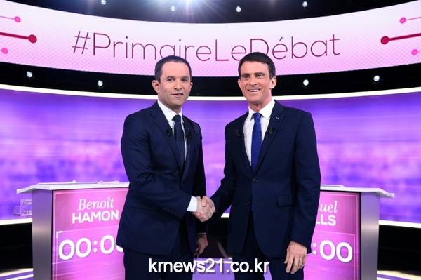 프랑스 생 드니에서 열린 TV 토론회에 참석해 악수를 나누고 있는 사회당 브누아 아몽(왼쪽) 전 교육장관과 마누엘 발스(오른쪽) 전 총리. 지난 사회당 대선 경선 1차 투표에서는 아몽이 1위를 차지했다.