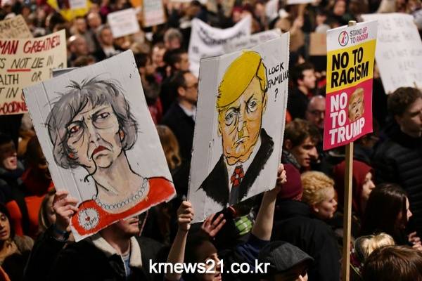 영국 런던 다우닝가 외곽에서 30일(현지시간) 시위자들이 도널드 트럼프 미국 대통령의 '반(反)이민 행정명령'에 대해 항의 시위를 벌이고 있다.