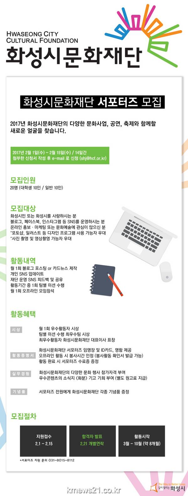 화성시 문화재단 서포터즈 지원은 2월 1일부터 15일까지 화성시 문화재단 홈페이지(www.hcf.or.kr)에서 지원서를 다운받은 후 이메일로 지원하면 된다. 선발인원은 대학생 10인, 일반 10인 총 20인이며, 합격자는 2월 21일 발표예정이다.
