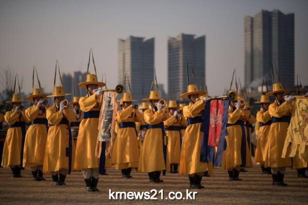 제임스 매티스 미국 국방장관이 한국 국방부에 도착하기 전 의장병들이 의전행사를 하고 있다.