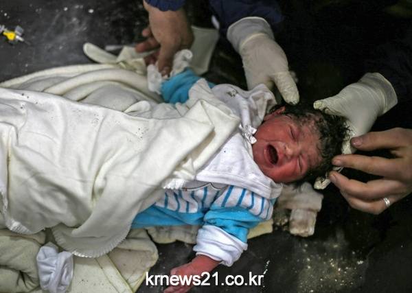 ▲ AFP / AMER ALMOHIBANY[제공자ⓒ 뉴스21통신. 무단전재-재배포 금지.]공습이 발생한 시리아 다마스쿠스 외곽에서 신생아가 임시로 만든 병원에서 치료를 받고 있다.