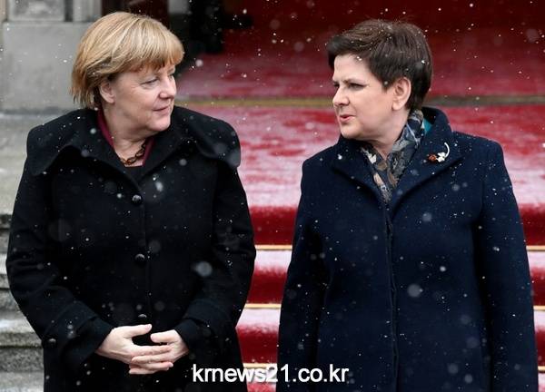 ▲ AFP / Janek SKARZYNSKI[제공자ⓒ 뉴스21통신. 무단전재-재배포 금지.]폴란드를 방문한 앙겔라 메르켈 독일 총리(왼쪽)가 베아타 시드워 폴란드 총리와 함께 있는 모습. 메르켈 독일 총리는 7일(현지시간) 시드워 총리와의 합동 기자회견에서 자국의 민주주의 경로를 상기했다며 폴란드 내의 법 준수를 강조했다.