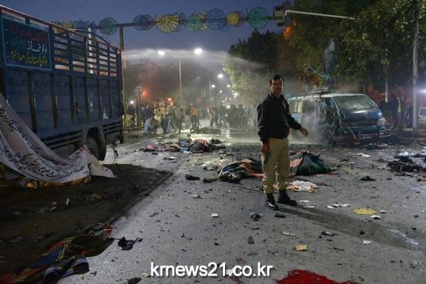 ▲ AFP / STR[제공자ⓒ 뉴스21통신. 무단전재-재배포 금지.]파키스탄 경찰이 13일(현지시간) 라호르에서 자폭테러가 발생한 후 현장 희생자들 옆에 서 있는 모습. 경찰은 이날 테러로 경찰 6명을 포함 최소 13명이 사망하고 82명이 부상했다고 밝혔다.
