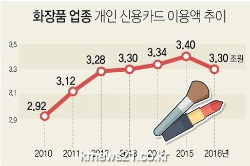 화장품 업종에서 개인 신용카드 이용액이 감소한 것은 관련 통계 작성 이래 이번이 처음이다.