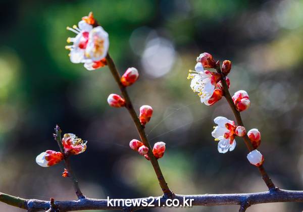 광양시 매화마을 매화꽃이 따뜻해진 날씨에 꽃망울을 터트려 성큼 다가온 봄소식을 전하고 있다.