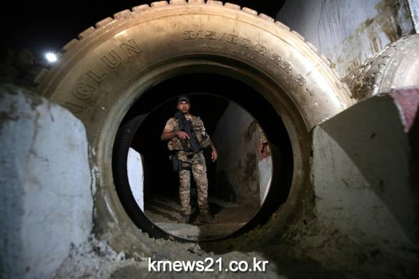 이라크 군이 모술 외각지역인 알부사이 마을에서 IS가 훈련 센터로 사용된 것으로 추정되는 터널을 살펴보고 있다.
