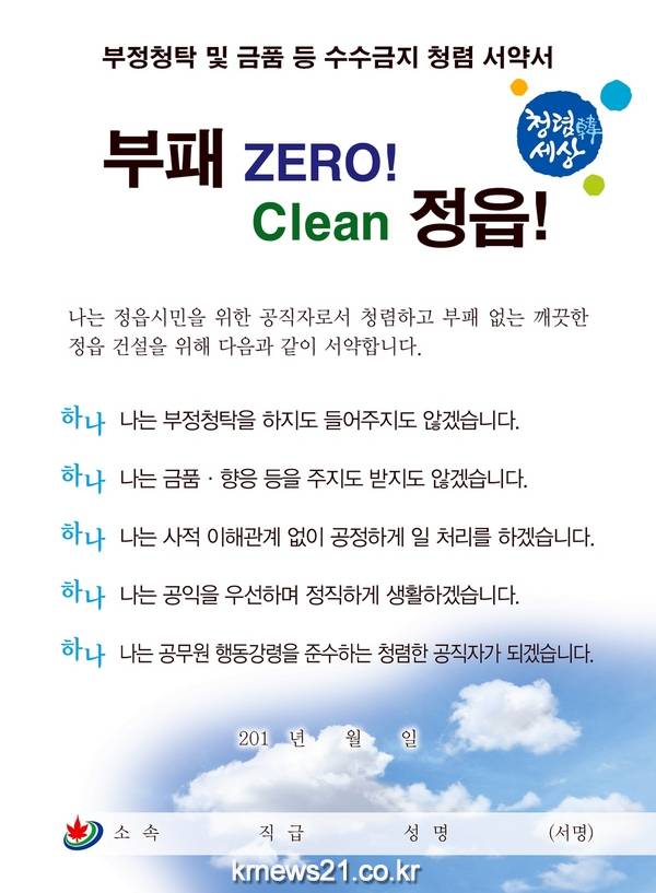 이와 관련해 시는 이달 초 각 부서장 주관으로 전 직원의 참여 속에 ‘부패 Zero! Clean 정읍!’ 실현을 위한 청렴 서약서를 작성하여 개인별 책상 위에 비치토록 했다.