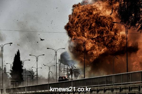이라크 모술에서 이라크 군과 IS와의 전투가 벌어지는 도중 차량이 폭발한 모습.