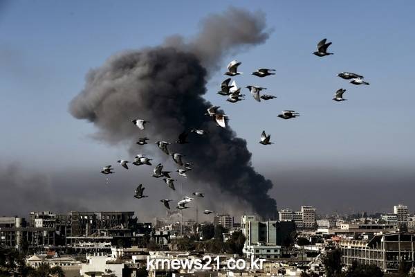 이라크 모술 서부지역에서 IS와 전투를 치르고 있는 이라크 군의 공습으로 연기가 일어나고 있다.
