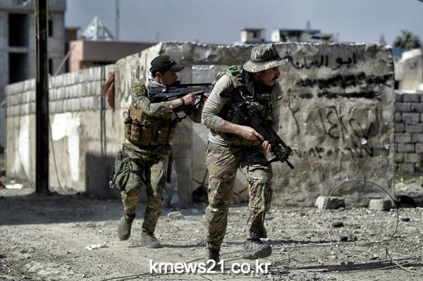 이라크 군인들이 IS로부터 모술 서부지역을 되찾은 후 이 지역을 순찰하고 있다.