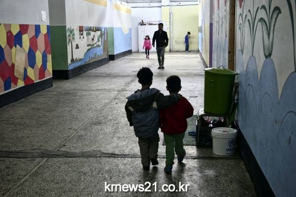 ▲ AFP / LOUISA GOULIAMAKI[제공자ⓒ 뉴스21통신. 무단전재-재배포 금지.]그리스 오이노피타에서 난민 캠프로 사용중인 이전 산업 창고에서 남자아이 두 명이 함께 걸어가고 있다.