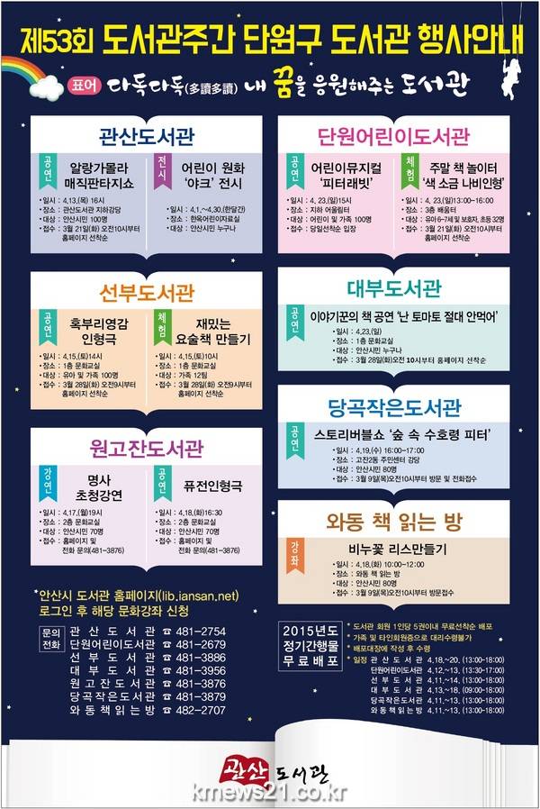 안산시 단원구 도서관에서는 4월 12일~18일 제53회 도서관주간과 4월 23일 세계 책의 날을 맞아 ‘다독다독(多讀多讀) 내 꿈을 응원해주는 도서관’ 이라는 표어로 다양한 행사를 운영한다.