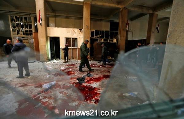 ▲ AFP/Louai Beshara [제공자ⓒ 뉴스21통신. 무단전재-재배포 금지.]시리아 보안군이 15일(현지시간) 자살 폭탄 테러가 발생한 다마스쿠스의 한 건물 내부를 조사하고 있다. 이날 다마스쿠스 2 곳에서 연쇄 자폭 테러로 32명이 숨지고 100명이 다쳤다.
