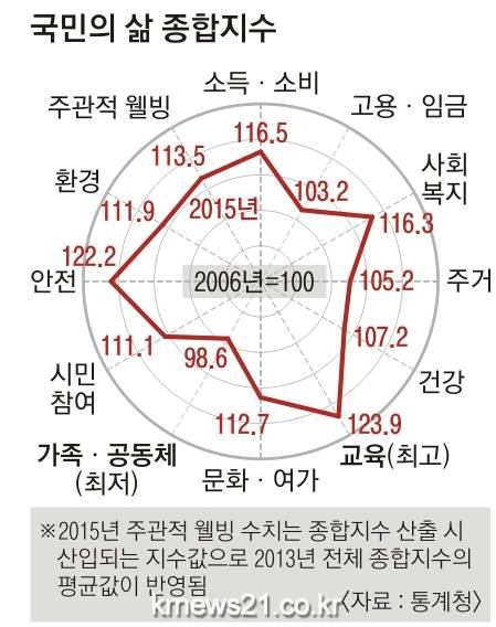 통계청과 한국삶의질학회는 ‘국민 삶의 질 종합지수’라는 지표를 새롭게 개발, 15일 첫 산출 결과를 발표했다. 2006년을 기준(100)으로 평가한 2015년의 삶의 질 종합지수는 111.8로 나타났다. 이는 같은 기간 우리나라 1인당 실질 국내총생산(GDP) 증가율 28.6%의 절반에도 못 미치는 것이다. 경제성장이 삶의 질 개선으로 곧바로 이어지지 않은 셈이다.