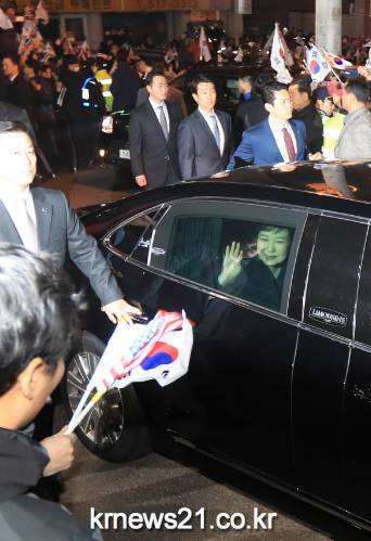 박 전 대통령이 전날 탑승했던 에쿠스 승용차가 서초동 서울중앙지검을 떠나 오전 7시5분쯤 골목 앞에 들어서자 지지자들은 태극기를 연신 흔들며 '대통령'을 연호했다. 지지자들은 전날 오후 9시쯤부터 속속 모여 밤을 새웠다.