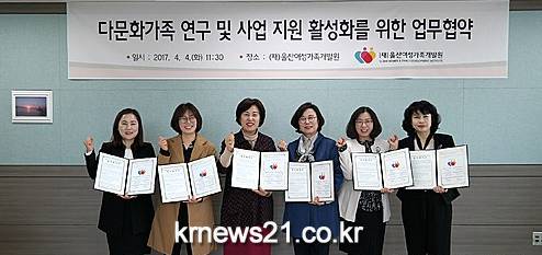 4일 재단법인 울산시여성가족개발원(원장 이정희)에서 울산지역 5개 구·군 다문화가족지원센터와 다문화가족 연구 및 사업 지원 활성화를 위한 업무협약식이 열리고 있다.