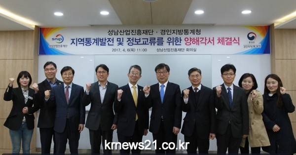 성남산업진흥재단(대표이사 장병화)과 경인지방통계청(청장 김남훈)은 4월 6일 성남시 분당구 정자동 킨스 타워에서 『지역통계 발전 및 정보교류』를 위한 양해각서(MOU)를 체결했다.