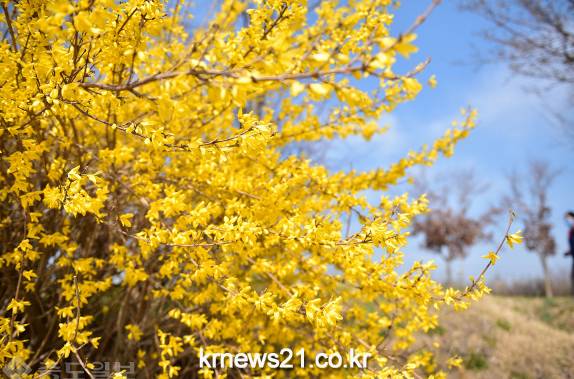 경기 여주시 남한강변 걷고싶은 거리에 봄의 전령인 개나리가 꽃망울을 터트려 눈길을 사로잡고 있다.