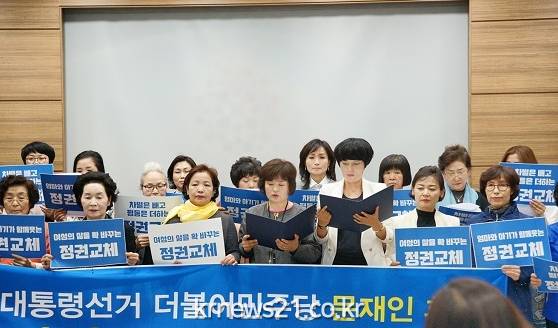 이들은 기자회견에서 ‘여성의 삶을 확 바꾸는 정권교체’, ‘차별은 빼고 평등은 더하는 정권교체’, ‘엄마와 아이가 함께 웃는 정권교체’ 등 구호도 외쳤다.