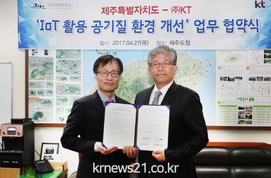KT(회장 황창규)는 27일 제주도청 회의실에서 제주특별자치도와 도내 미세먼지와 같은 대기오염 문제를 체계적으로 해결하고, 지역의 효율적인 공기질 관리를 위한 ‘IoT 활용 공기질 환경 개선 협약’을 체결했다고 28일 밝혔다.