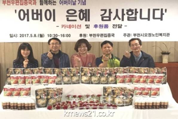부천시오정노인복지관(관장 김정은) 밑반찬배달 자원봉사자 27명은 올해 어버이날을 맞아 부천우편집중국이 후원한 선물을 들고 오정지역 75개 저소득 가정을 방문했다.