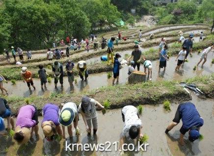 경기 양평군은 강상면 상촌마을의 '산적마을 다랭이 논'에서 300여 명의 체험객들이 참여한 가운데 지난 14일 전통 모내기 체험행사를 가졌다고 15일 밝혔다.