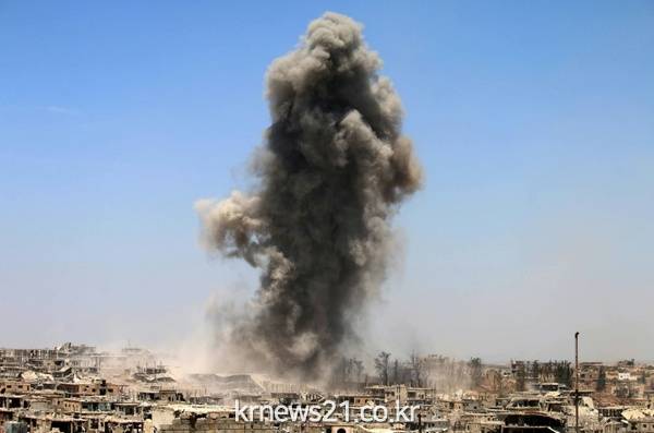 공습 당한 시리아 도시 다라(Deraa)에서 연기가 올라오고 있다