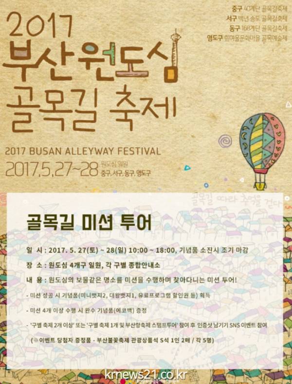 부산시는 오는 27~28일 부산 중구, 서구, 동구, 영도구 등 원도심 4개구 일원에서 '2017 부산원도심골목길축제'를 개최한다.