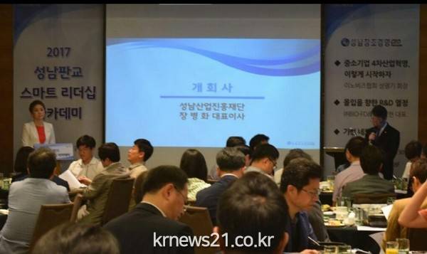 성남산업진흥재단은 기업가정신 및 기술 개발을 통한 기업 성장 노하우 전수를 위해 이노비즈 협회와 공동으로 5월 25일 판교 메리어트 호텔에서 성남·판교 기업 CEO, 스타트업 및 예비창업자 등 100여 명이 참석한 가운데‘제1차 성남·판교 스마트 리더십 아카데미’를 개최했다.