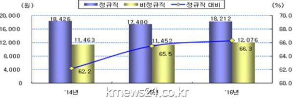 이중 정규직의 임금은 1만8212원인 반면 비정규직은 이의 66.3% 수준인 1만2076원으로 나타났다. 전년도 정규직 대비 비정규직의 임금 수준은 65.5%로 1년 전에 비해 0.8%p의 소폭 개선이 있었다.