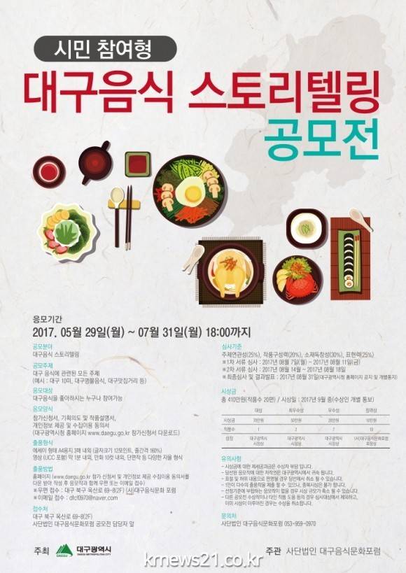 대구시가 주최하고 (사)대구음식문화포럼이 주관하는 ‘대구음식 스토리텔링 공모전’이 오는 29일부터 7월 31일까지 2개월간에 걸쳐 열린다.