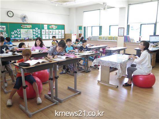 움직이는 교실은 친환경 자재를 사용한 ‘서서 공부하는 책상’, ‘짐볼’, ‘균형방석’으로 꾸며졌다. 교실에 서서 책을 보거나 짐볼에 앉아 몸을 튕기고균형방석 위에서 올바른 자세를 유지하려고 노력하는 등 아이들이 각기 원하는 방식으로 자연스럽게 신체활동을 늘릴 수 있도록 활동적인 수업 환경을 조성했다.