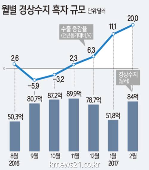 한국은행이 5일 발표한 '2017년 4월 국제수지(잠정)'를 보면 지난 4월 상품과 서비스를 포함한 경상수지 흑자는 40억달러로 집계됐다. 이로써 경상수지 흑자는 2012년 3월부터 62개월 연속 이어가면서 최종 흑자 기록을 경신했다.