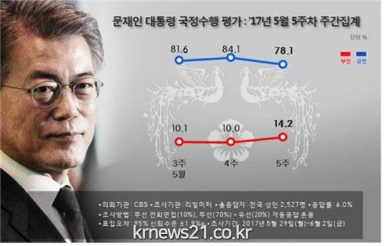 ▲ △17년 5월 5주차 국정수행 지지도 집계/자료=리얼미터리얼미터 2017년 5월 5주차 주간집계(무선 80 : 유선 20, 2,527명 조사)에서, 문재인 대통령의 지지율이 취임 후 처음으로 상승세가 꺾이며 70%대 후반으로 하락한 것으로 나타났다.