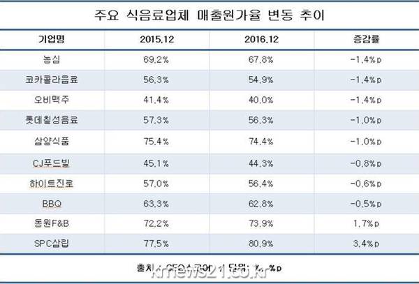 가격을 올린 오비맥주 역시 매출원가율이 전년동기보다 1.4% 하락한 40.0%였고, 하이트진로도 0.6% 하락한 56.4%로 나타났다. 코카콜라는 1.4%p 하락한 54.9%, 롯데칠성음료는 1.0%p 하락한 56.3%의 매출원가율을 보이는 등 음료업체 대부분이 매출원가율이 떨어졌음에도 가격을 올린 것으로 드러났다.