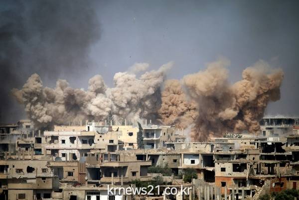 시리아 반군 거점인 다라에서 공습으로 연기가 피어 오르고 있다.