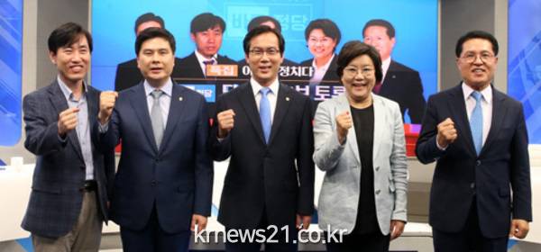 ▲ △ TV토론 나선 바른정당 대표 후보들 바른정당 대표 선거 후보들이 16일 오후 서울 중구 TV조선 스튜디오에서 열린 후보자 토론회 시작 전 주먹을 쥐어 보이며 선전을 다짐하고 있다. 왼쪽부터 하태경, 지상욱, 김영우, 이혜훈, 정운천 의원. 자유한국당은 17일 새 지도부 선출을 위한 7·3전당대회 후보자 등록을 마감하고 본격적인 당권 레이스의 막을 올렸다.