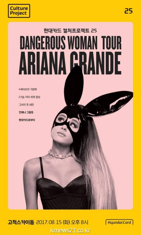 20일 현대카드(대표 정태영)에 따르면 그란데는 오는 8월 15일 오후 8시 서울 고척스카이돔에서 펼쳐지는 '현대카드 컬처프로젝트 25 아리아나 그란데'를 통해 한국 팬들과 처음 인사한다.