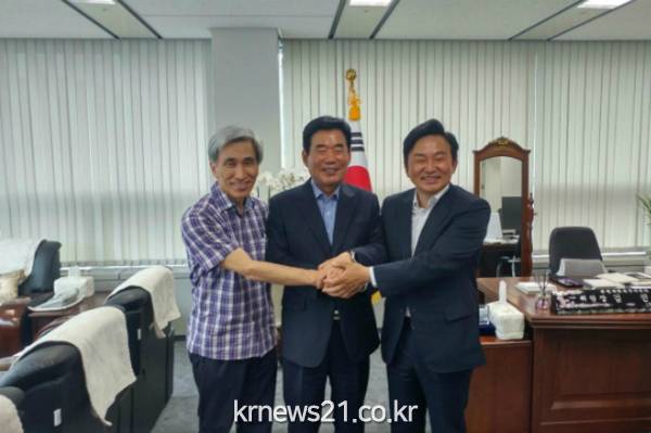 ▲ △ 20일 원희룡 제주지사(오른쪽)가 김진표 국정기획자문위원장(가운데)을 만나 포즈를 취하고 있다. /사진제공=제주도제주4·3의 완전한 해결'과 '제주특별자치도 완성'이 문재인 정부의 국정과제에 포함된다.