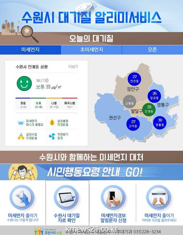 수원시 홈페이지(http://www.suwon.go.kr)에는 ‘대기 질 알리미 서비스’를 운영해 시민들에게 각 구의 (초)미세먼지·오존 농도 정보를 실시간으로 제공하고 있다. 수원시 미세먼지 저감 정책 방향과 상세한 수원시 대기 질 자료를 볼 수 있고, 미세먼지 경보 알림 문자를 신청할 수 있다. 시민들이 미세먼지 저감 아이디어를 제안할 수도 있다.