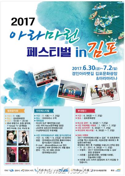 한편 “2017 아라마린페스티벌 in 김포”는 오는 6월 30일부터 7월 2일까지, 3일간 경인아라뱃길 김포문화광장 및 아라뱃길 유역에서 펼쳐지며 해양레저 자격증 특성화 교육은 상시 접수 및 참여가 가능한 프로그램으로 참가신청은 워터웨이플러스에 문의하면 된다.