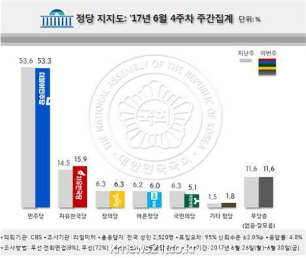 정당 지지도에선 민주당이 전주보다 0.3% 포인트 내린 53.3%를 기록했다. 민주당의 지지율은 7주 연속 50%대 초중반의 강세를 이어갔다.