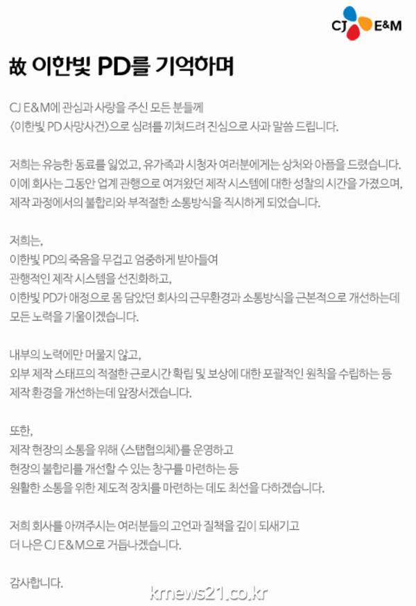 CJ E&M은 이어 “회사는 그동안 업계관행으로 여겨왔던 제작 시스템에대한 성찰의 시간을 가졌으며, 제작과정에서의 불합리와 부적절한 소통방식을 직시하게 되었다”며 “이한빛 PD의 죽음을 무겁고 엄중하게 받아들여 관행적인 제작 시스템을 선진화하고, 이한빛 PD가 애정으로 몸 담았던 회사의 근무환경과 소통방식을 근본적으로 개선하는데 모든 노력을 기울이겠다”고 했다.