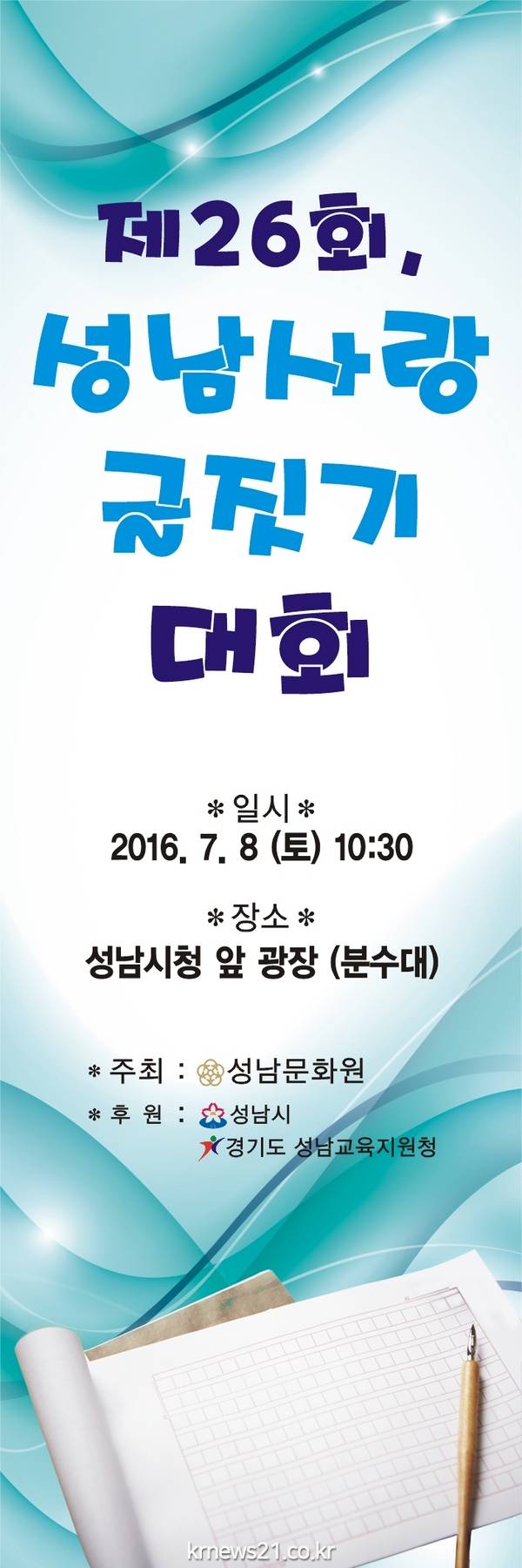 성남문화원(원장/김대진)은, 자라나는 청소년들에게 내 고장에 대한 애향심과 자기 정체성을 심어주고 상상력과 창의력을 제고하는 기회를 주고자, 제26회,「성남사랑 글짓기 대회」를 7월 8일 오전 10시30분부터 성남시청 분수대 광장에서 개최한다.