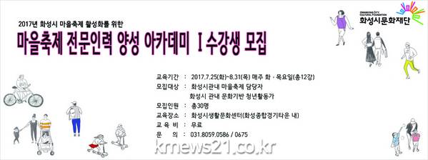 화성시 문화재단(대표이사 권영후)은 오는 7월~8월까지 운영되는「마을축제 전문 인력 양성 아카데미Ⅰ」의 수강생을 모집한다.